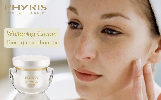 – Sử dụng các sản phẩm đặc trị nám: Phương pháp này có hiệu quả tốt, an toàn, tiết kiệm chi phí, nhưng cần thời gian để có thể phát huy tác dụng. Cách tốt nhất và hiệu quả tốt nhất là sử dụng mỹ phẩm Whitening Cream của Phyris. Sản phẩm này được sử dụng rất nhiều trong quá trình điều trị nám, vì có chứa tổ hợp Active White Complex, vitamin C, Axit amino tự nhiên…